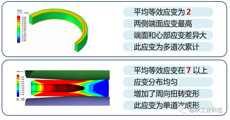 为了进一步分析辗扩过程和PTR过程中工件的等效应变分布,图3给出了外径Ф150mm套圈等效应变的对比结果。上下分别为辗扩和PTR改性过程。